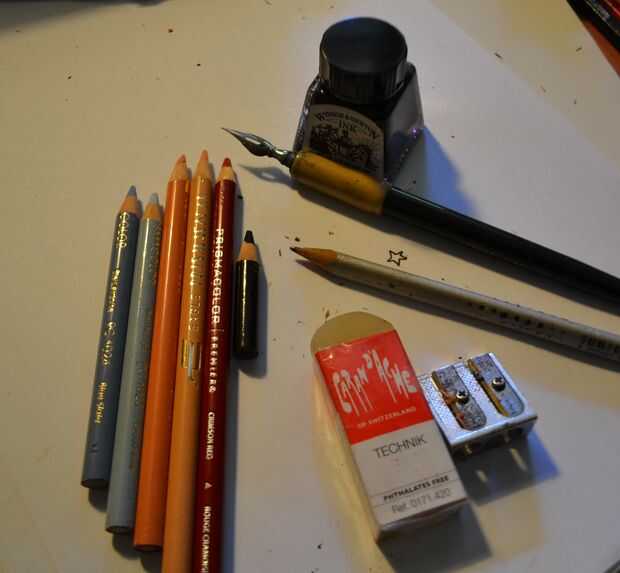 material: -lápiz (2 o 3 B); -lápices de colores suaves (yo usé prismacolor); -tinta y plumín o pluma de tinta negra; -alisar el papel; -borrador no abrasivo (el especie casi transparente); -Sacapuntas.