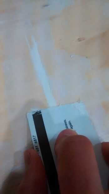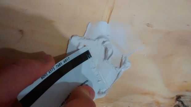 Ahora es el momento de incluso los problemas más irremediable con la Junta. A partir de los defectos más grandes, como grandes cuchilladas, huecos ni parches ásperos, propagación plaste pasta sobre la placa y distribuir uniformemente por suavemente pero firmemente tirando de una tarjeta de regalo o alguna otra pieza flexible de plástico sobre él.