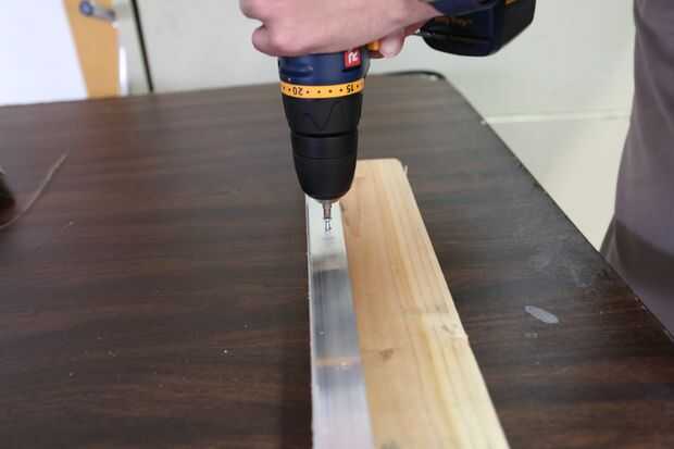 Tomar la viga de apoyo de aluminio en forma de "L" y colocar en un estante, coloque la viga de apoyo de aluminio con 1/2 pulgada galvanizados tornillos para que la forma de "L" es el lado derecho para arriba.