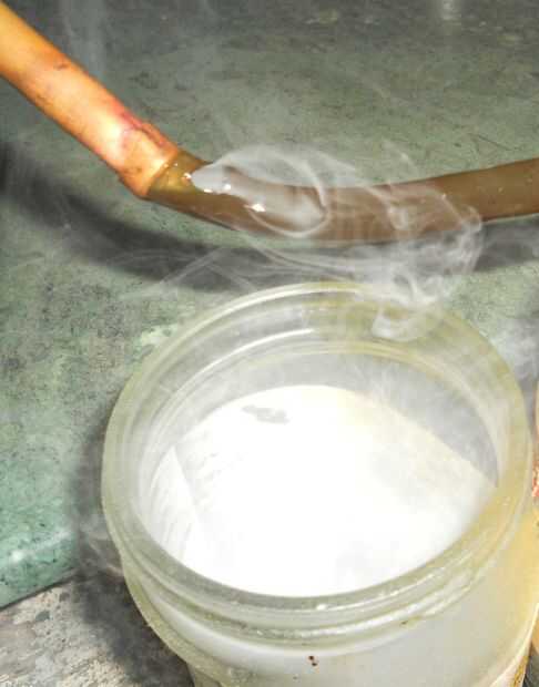 Inicialmente verás humos fluya fuera del condensador, luego gotas serán lenta, y finalmente tienes un chorro de aceite utilizable que sale! Al final de la reacción, al abrir la cámara que estaba inicialmente llena, se sorprendió al encontrarla vacía, sólo carbonizado.