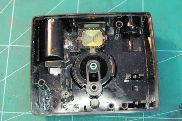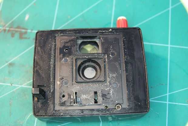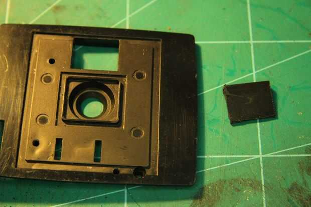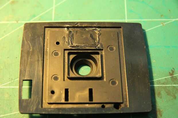 Usted cortará su pequeño trozo de plástico plano negro para caber en el agujero cuadrado que solía ser el visor. Pegamento en su lugar. También debe ser cerrado, así el pequeño agujero rectangular en el lado.