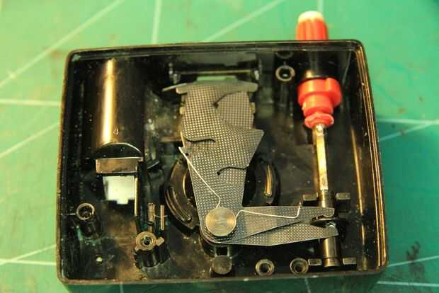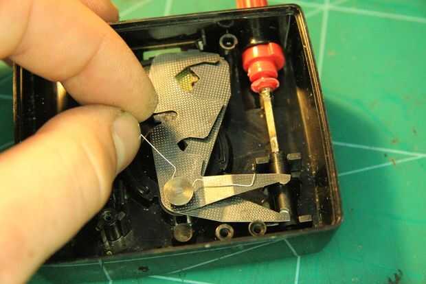 Doblar el muelle un poco, por lo que será un poco más elástico. Inserte el resorte bajo la "tuerca" como en la foto y asiento en su posición correcta en las hojas.