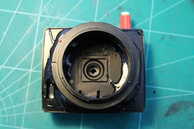 Cuando esté todo seco, es hora de pintar la cola con el marcador negro plano. Esto minimizará el resplandor de la lente, porque el pegamento es brillante.