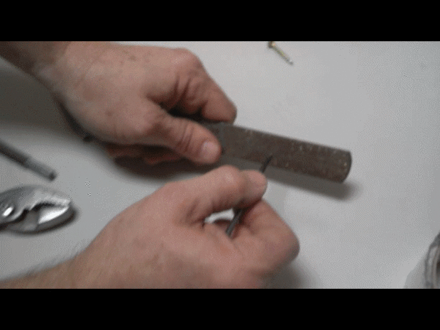 A continuación, limar la punta de un clavo de carpintería para que la punta es plana, como se muestra en la imagen siguiente. Limar la uña tendrá un poco de tiempo.
