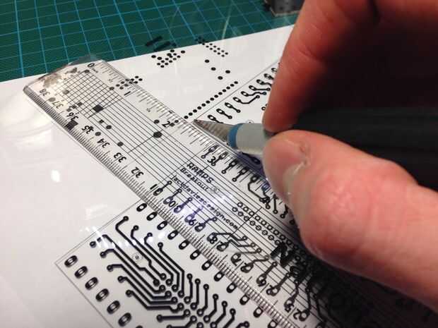 Después de la etapa de diseño de computadora las almohadillas, Vias y capas superiores fueron exportadas de Eagle para las placas de caras solo y una capa inferior adicional para placas doble caras. La obra de arte fue reflejado e impresa en hoja de acetato transparente; Imprimí dos copia para que 2 hojas podrían ser capas para eliminar y fugas de luz que podrían ocurrir debido a la cobertura de tóner desigual.