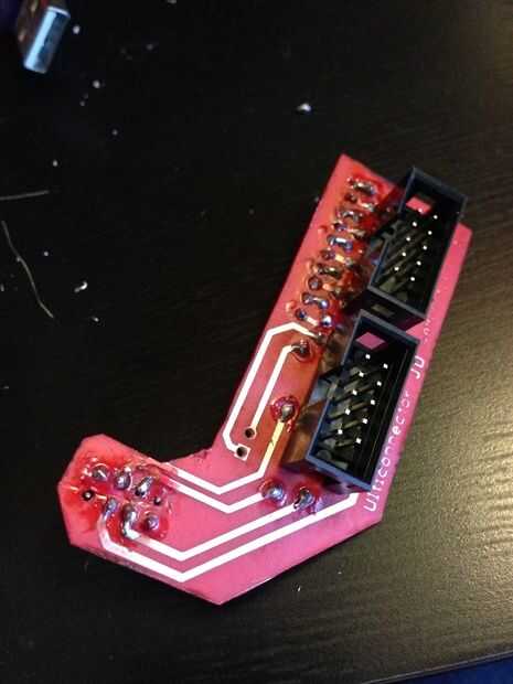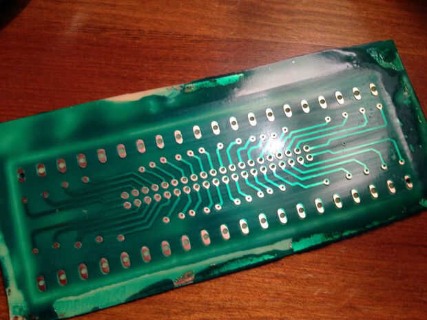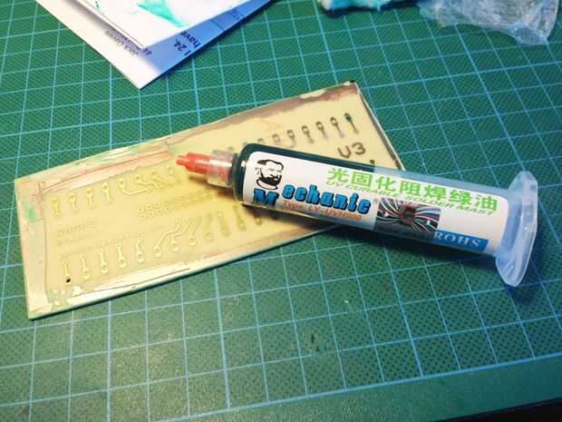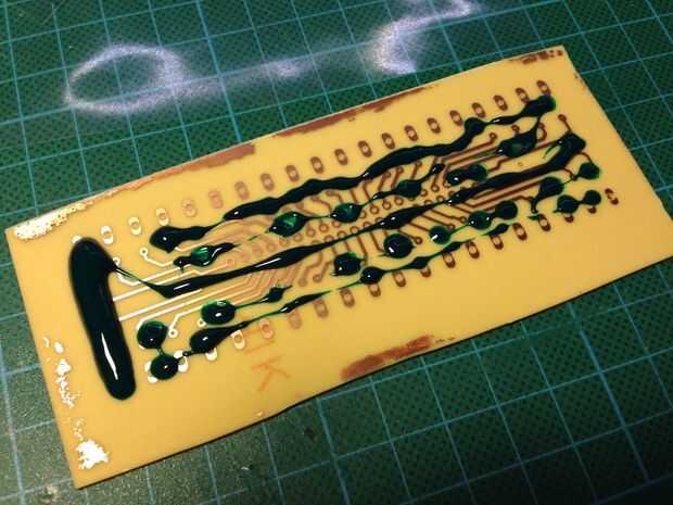 La última etapa fue terminar la Junta retirando resistir etch con isopropanol alcohol o quitaesmalte removedor, este expone entonces el cobre brillante que puede ser soldado a inmediato o acabado con una máscara de la soldadura. He comprado un tubo de verde UV curable máscara de la soldadura en línea relativamente barato. Esto requiere un proceso similar a la foto grabado método para aplicar la máscara a la Junta. Otro producto que podría ser utilizado fue estaño líquido que capas los rastros de cobre y con una capa muy delgada de estaño que ayuda con la soldadura proceso y se detiene a la coper oxidantes.
