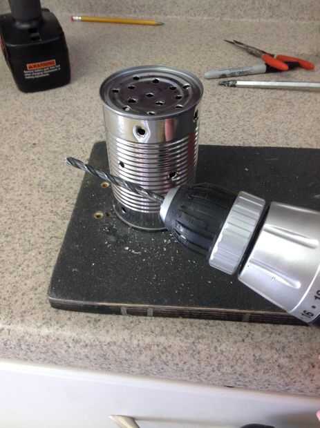 Puede utilizar un marcador para determinar dónde perforar los orificios pero a perforado en puntos al azar. No importa dónde usted perforar, siempre y cuando no es excesiva. Después de la perforación que puede ser algunos metal pegado alrededor de los orificios de la can así Utilice alicates para elegir aquellos fuera. También usé un destornillador de cabeza Phillips (el tamaño más grande) para empujar los agujeros en la lata debido a sacar la broca que algunos agujeros ser levantado y vanguardista.