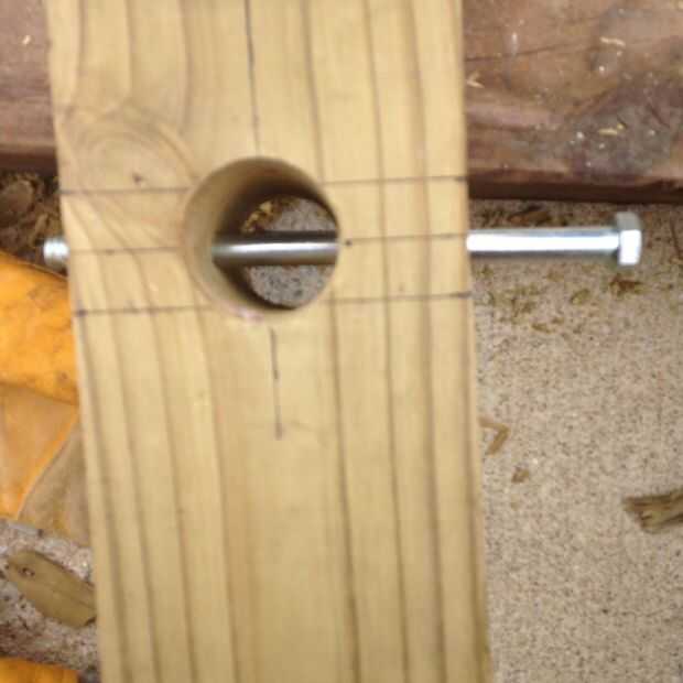 4. a continuación taladre el agujero para el perno que pasar por el post y la madera al mismo tiempo.