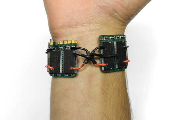 Entonces, hilo de rosca del alambre por los agujeros y ajustarla de manera se adapta cómodamente. Usted puede necesitar cambiar alrededor de la orden de diferentes circuitos de tamaño para obtener el máximo confort (por ejemplo, poniendo los más pequeños en la curviest parte de la muñeca).