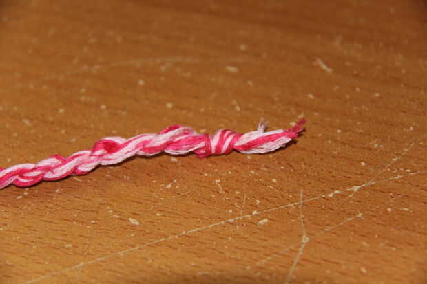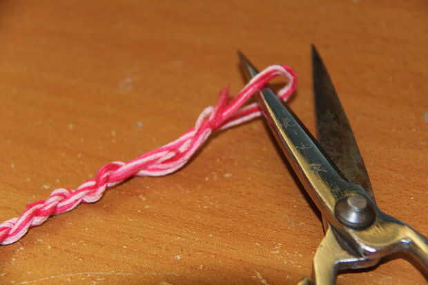 Con el extremo con los extremos sueltos, fije la pulsera con un nudo. En la foto, mi pulsera empezó a desenrollar, pero puede solucionarlo fácilmente una vez que el nudo esté en su lugar. Cortar los cabos sueltos más cerca al nudo si lo desea. Aquí, sólo decidí cortar los bucles restantes y dar cualquier hilos sueltos en el nudo un recorte.