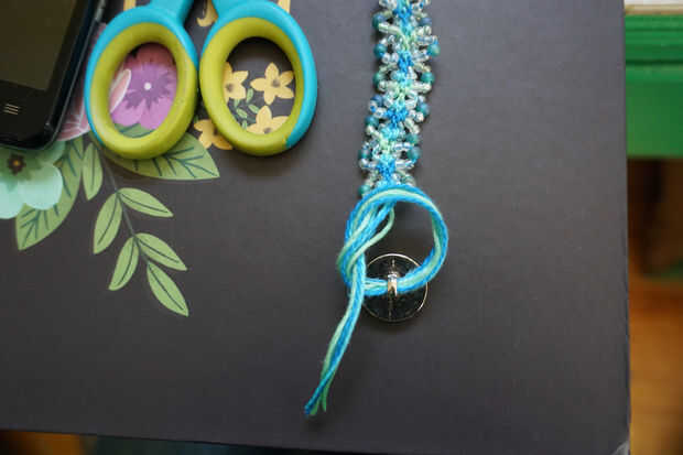 ¿Creo que termines anuda? MAL! Sólo uno más bien. Te lo prometo. En primer lugar, pase el botón en todos los hilos. luego atar un nudo grande (o dos) en el extremo de los filamentos y cortar el hilo sobrante. Dejé mitad una pulgada solo porque pensé que parecía agradable, pero si no quieres dejarlo más largo entonces solo puede cortar los hilos de rosca corta. No importa cómo dejar los hilos en exceso, reforzar el nudo grande con esmalte de uñas transparente o claro pegamento secado si tienes algunos.