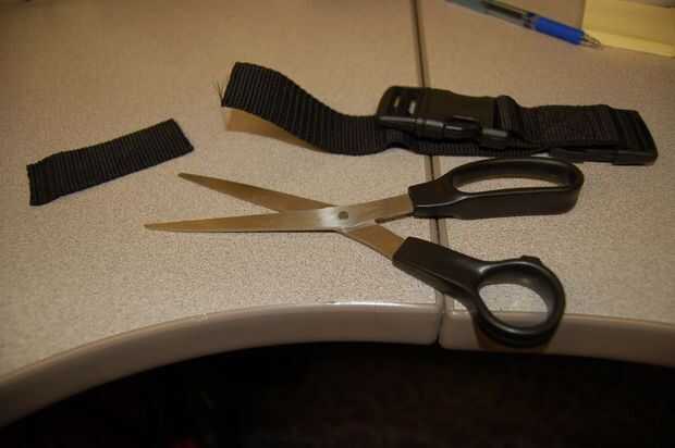 -El primer paso que tomé fue cortar un trozo de Nylon de la etiqueta del equipaje, cerca de 2 1/2 pulgadas de longitud. Quemado/chamuscado los extremos de nylon con un mechero para evitar que se deshilache.