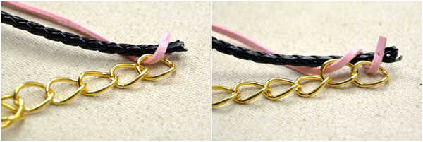 Comenzar a tejer el cordón de gamuza a través de los eslabones de la cadena para envolver el cordón de cuero negro.
