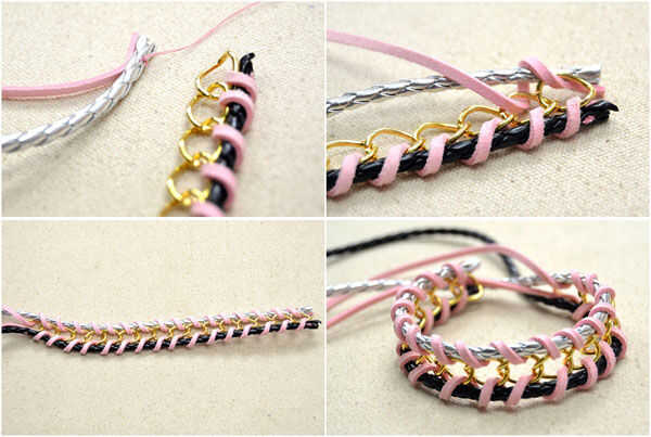 Tomar el cable de cuero blanco y otro rosa de gamuza. Repita los mismos procedimientos por encima al otro lado de la cadena.