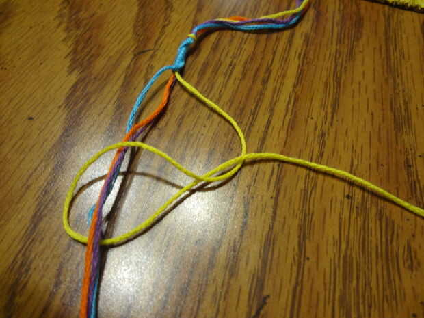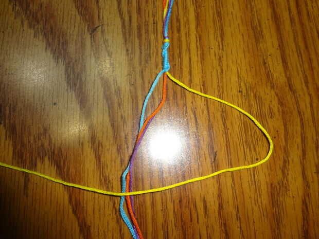 una pulsera bastante sencillo que sólo requiere 1 nudo.  Utilicé 4 colores (1 azul, rojo 2, naranja 3, amarillo 4) pero se puede elegir en cualquier lugar entre 3-8 colores.Materiales que necesitas:-Cadena (a veces llamada seda en tiendas de artesaní