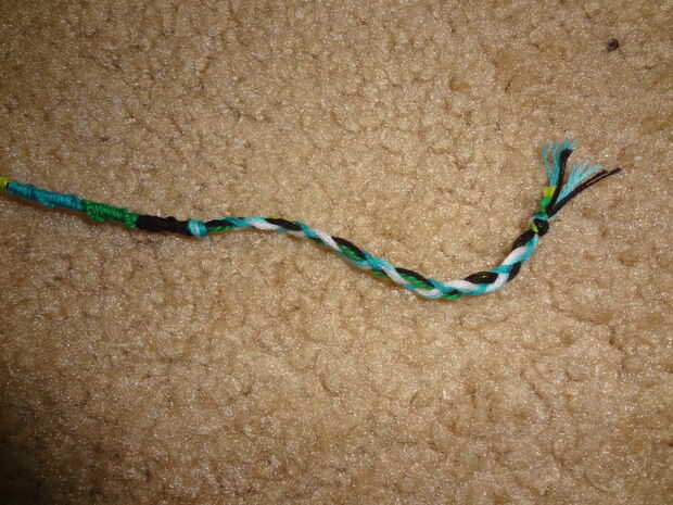 una pulsera bastante sencillo que sólo requiere 1 nudo. Utilicé 4 colores (1 azul, rojo 2, naranja 3, amarillo 4) pero se puede elegir en cualquier lugar entre 3-8 colores.Materiales que necesitas:-Cadena (a veces llamada seda en tiendas de artesaní