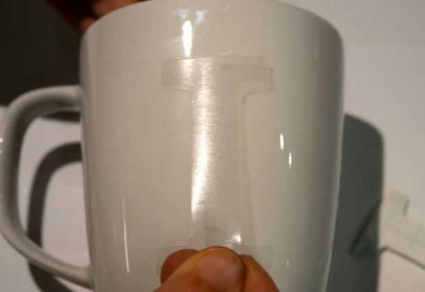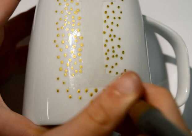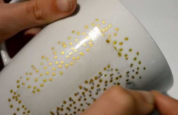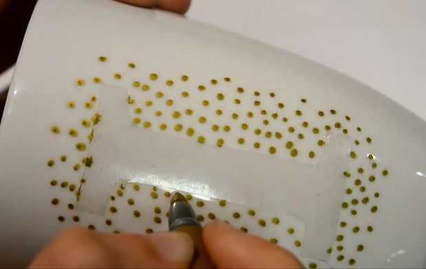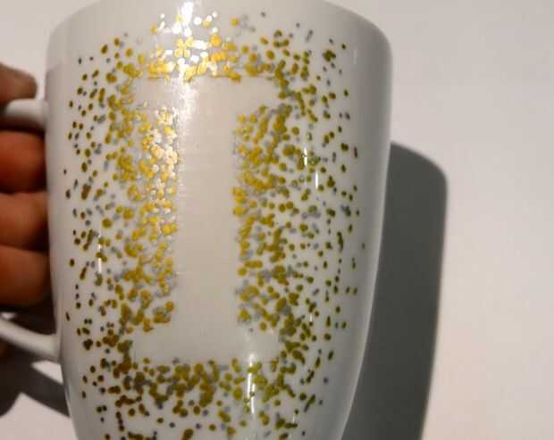 Primero tienes que ponerte la letra de su taza y luego sólo tiene que empezar a pintar pequeños puntos con sus marcadores alrededor de la letra. Cuando estés satisfecho con el diseño que solo tienes que pelar apagado la letra. Si hay cualquier imperfección puede limpiar con alcohol.