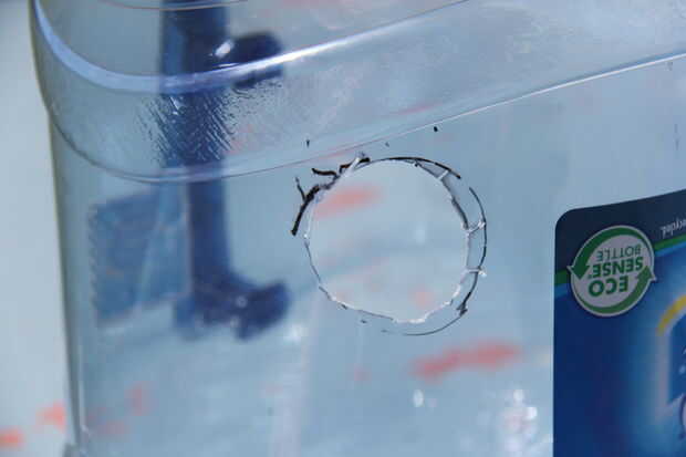 Paso 2: Ahora que has marcado tus frascos, utilice un taladro hacer un agujero donde la sierra comenzará a cortar. Esta parte es complicada porque usted va probablemente a utilizar tubos circulares y es bastante difícil hacer círculos exactos. Pero no desmayes. Simplemente marque el conjunto un poco más pequeño que el tubo. Entonces utilice la sierra para cortar los bordes del círculo. Así, cuando se ensamble el purificador de agua, se empuja el tubo en se bloqueará en su lugar.