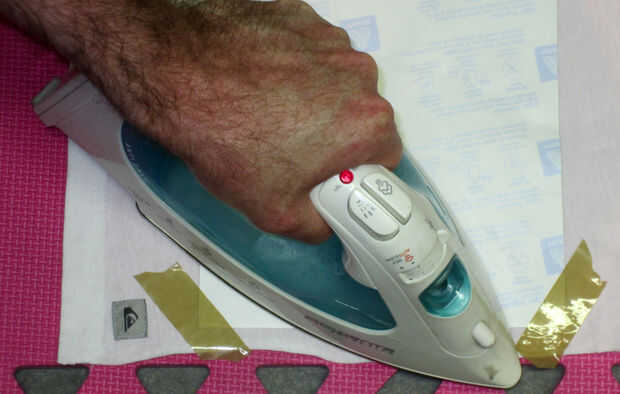 Pone la tela plana y el hierro en la transferencia de papel para que se haga sobre su cara cuando se pone el pasamontañas en posición. Siga las instrucciones en el papel del hierro en la transferencia para transferir las imágenes a la tela (Nota: no use cinta para fijar el papel de transferencia como lo hice del embalaje, se derretirá y hacer un lío!).