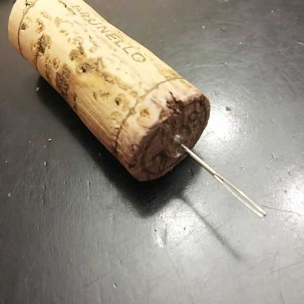 Cubrir el extremo afilado de la aguja con epoxy y luego pegar en el centro de su corcho, fui un poco más de 1/2 profundo.