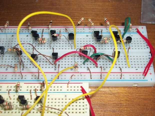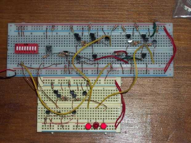 Si nunca han visto en el datasheet del microcontrolador, probablemente has visto algo sobre registros. Los registros son poco uno o dos bytes memoria contenedores en microcontroladores. El registro en este instructable puede contener 3 bits de datos (b y c me quedo sin espacio en mi breadboards) usando transistores. Hice esto para probar que puedo, sin embargo, no práctico ya que requiere de un registro de 8 bits 64 transistores, resistencias de aproximadamente 64 y un montón de espacio.