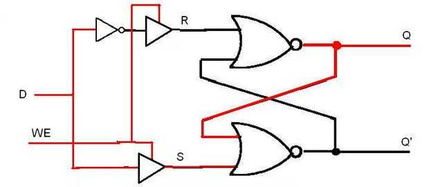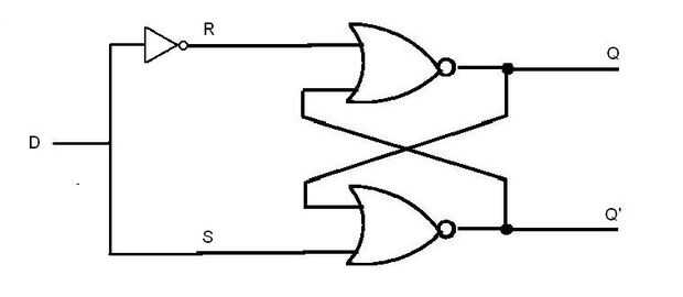Ahora la pregunta se convierte en ¿cómo hacer todo esto pasar con sólo una entrada? Hacemos esto conectando la línea de datos a la entrada Set y conectar a la línea de Reset a través de un inversor.