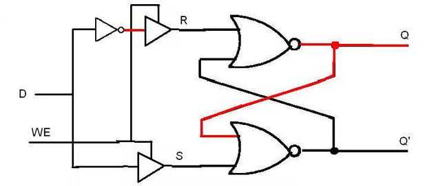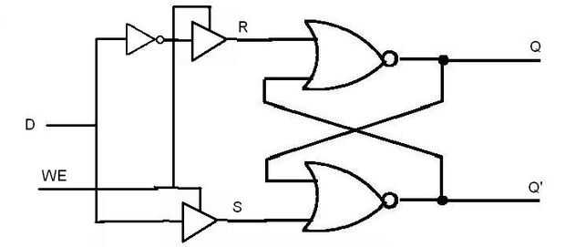 Hasta ahora, cuando datos están altos, es alta y Reset es bajo asi Q es alta. Si datos de baja, entonces baja Set y Reset va hacer alta Q desciendan y ~ Q vaya alta. Ahora tenemos otro problema. El registro de cambios de Estados cuando los datos no, no cierre como nosotros queramos. ¿Cómo solucionar esto? Mediante la adición de un escriba habilitar. Podemos hacer esto añadiendo un buffer cerrado. Actúa como un interruptor así que si la línea del interruptor va alta o baja el buffer o bien activar o desactivar, respectivamente. Ahora, incluso cuando la línea de datos puede cambiar los Estados, los datos pueden permanecer igual.