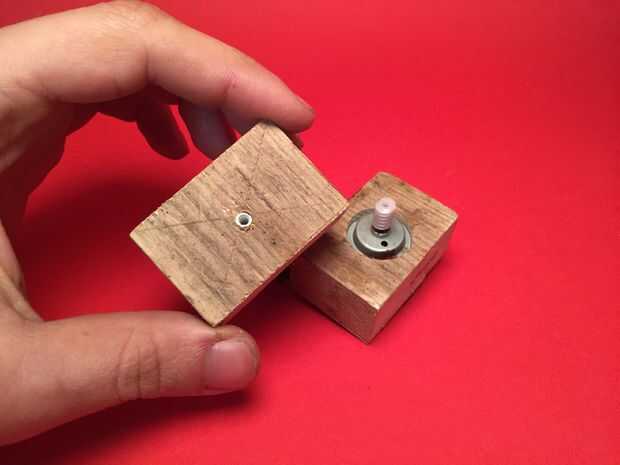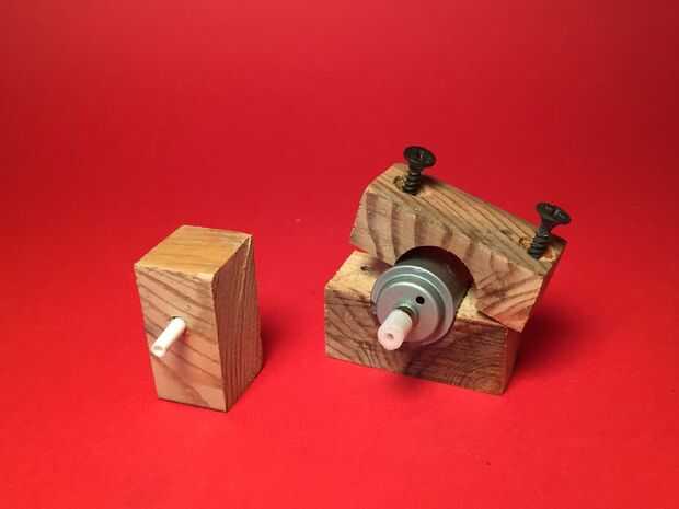 Usted podría montar el motor entre dos piezas de madera por dos tornillos, o puede perforar un orificio de 1mm más pequeño que el motor para pulsar dentro de la pieza de madera con un tornillo de banco, una pinza o un par de golpes de martillo.
