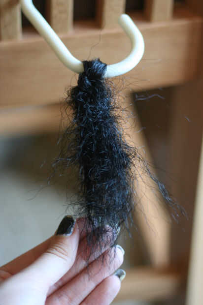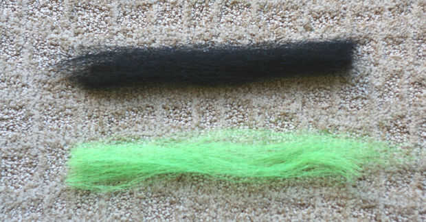 Ahora toma las dos piezas iguales (estoy haciendo un pavor de largo medio por lo que va a utilizar las secciones de 1/4 longitud,) y decida cuál será su color superior. Usted querrá un poco más pelo en la parte superior y un poco menos en la parte inferior, pero eso no importa mucho.