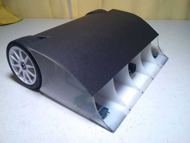 Me tomó mucho tiempo para el diseño de mi campana. Ya que este robot fue pensado para el combate (competición), es esencial tener una capucha muy accesible, en caso de problemas comienzan a aparecer durante la competición. Mi primera versión de campana había utilizado una hoja de 1/8 Junta de ilustración. El segundo utiliza una hoja de metal doblada, utilicé clip de la carpeta deslizante como el Monte.