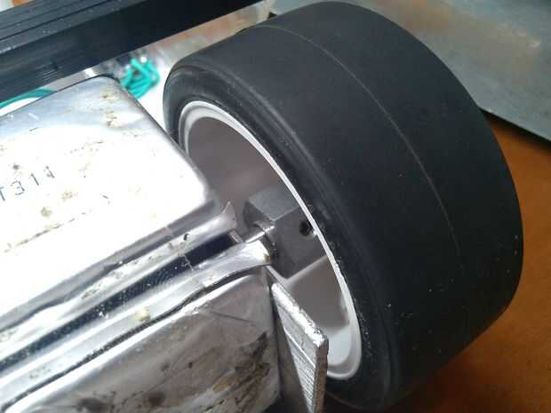 Para las ruedas, necesitaba un adaptador / ejes para las ruedas de Tamiya RC, por lo que fabricado minas utilizando una máquina de torno. Si quieres los, listos hechos, vaya a BaneBots.com, que venden una rueda + hub paquete.