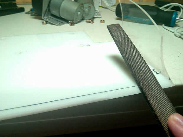 Sumobots necesita tener una cuña afilada para cucharear el competidor, en el combate cara a cara, con la cuña más aguda generalmente prevalece. Hoja de la pala fue diseñado para el combate por lo tanto debe ser perfecto. De nuevo, herramientas rotatorias giran demasiado rápido, por lo tanto no tiene mucho control sobre él. Usé el archivo antiguo fiel para hacer el trabajo.