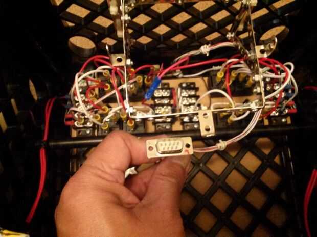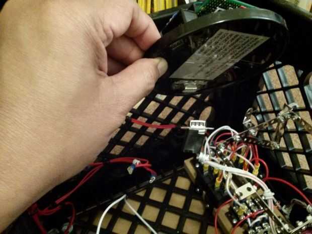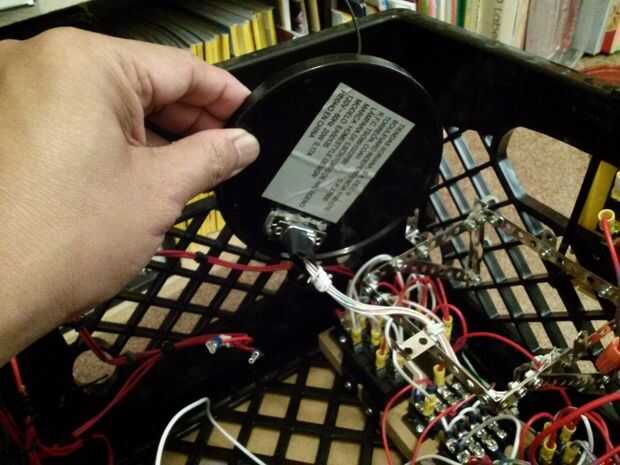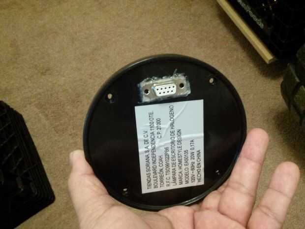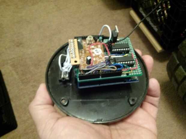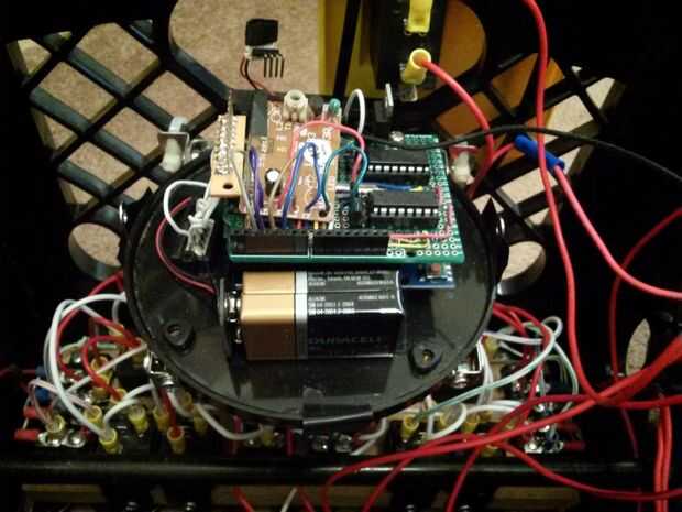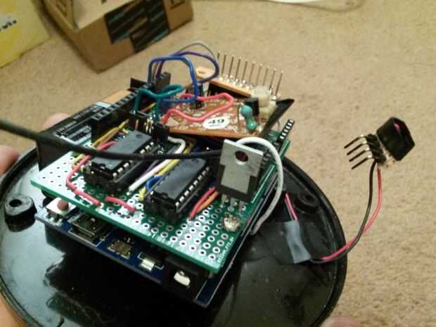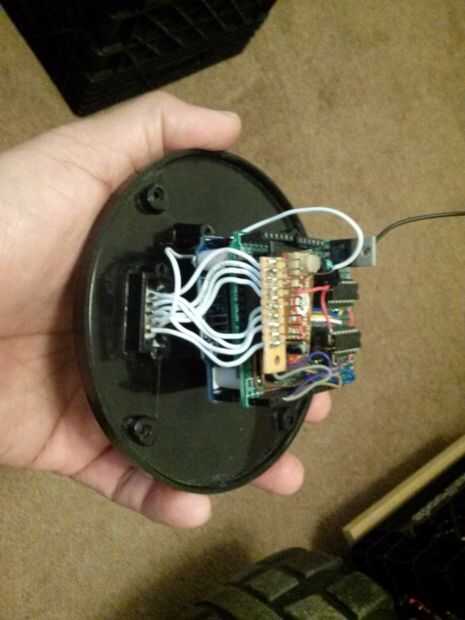 Hice una ronda base que había salvado de una lámpara de mesita de noche rota para montar los tableros de control de Arduino (Arduino en la parte inferior, escudo Arduino L293 en el medio y la placa de Rx en la parte superior). Alambré un arnés conector pequeño entre el escudo de Arduino y un conector DB-9 que montara en la base con cola caliente. La batería de 9 voltios tiene un pequeño conector de 4 pines (se utilizan solo dos pasadores; los otros son solo para soporte mecánico) que se conecta a Vin y tierra del escudo Arduino. Un plomo de 12 voltios para el L293 era conectado directamente a la fuente de chip, pasando por alto el conector de borde del tablero.