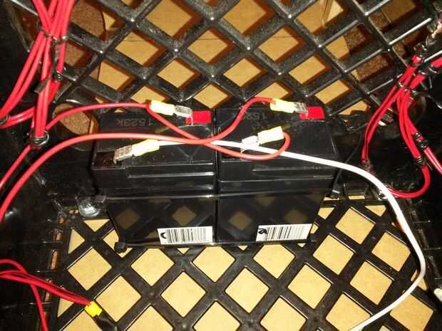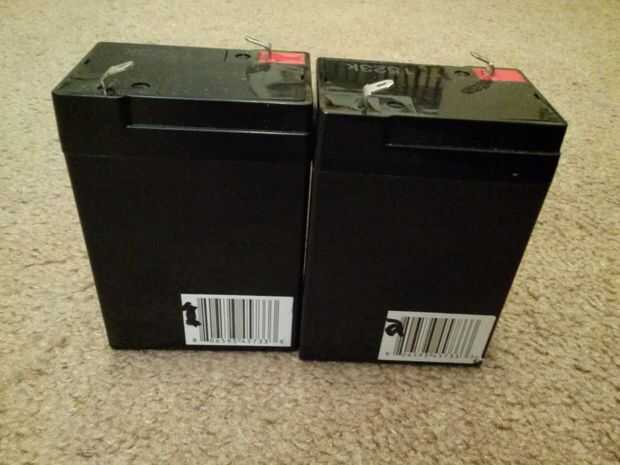 Usé dos 6 voltios 4.5 Ah sellada las baterías de plomo para que la tensión del motor se puede seleccionar manualmente para ser 6 o 12 v. Con 12 voltios y sin el peso adicional de camiones de Jeep y fuego, mi vehículo se mueve demasiado rápido. Me conformé con sólo 6 voltios. Tiene la desventaja de drenaje de las baterías más rápido que el otro. Puedo vivir con eso.