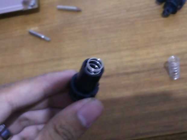 que la primera foto, se puede comparar el tamaño de la srpring estándar (uno grande) y el muelle recuperado. El muelle estándar son más duras que la primavera rescatada y que no sea realmente bueno porque es demasiado difícil, pero los resortes rescatados son más suaves, usted conseguirá más flexible interruptor de choque que el estándar. Poner el salvado en el cañón y cierre el barril empujando la parte inferior y gire en sentido antihorario hasta que se trabó.