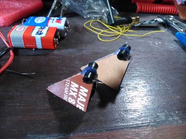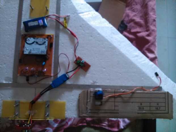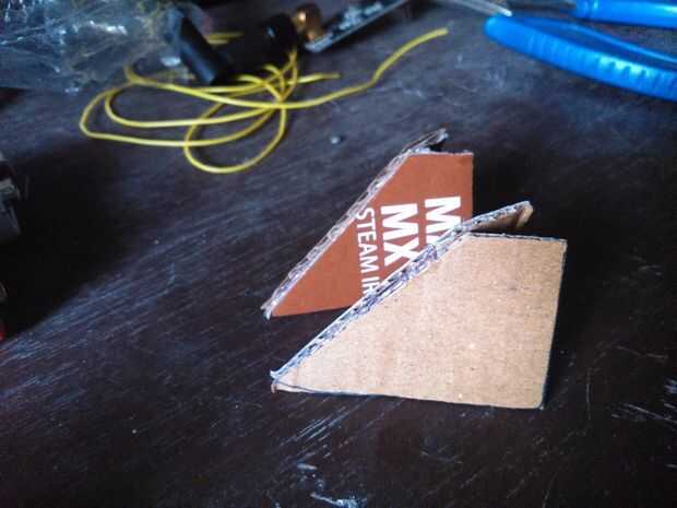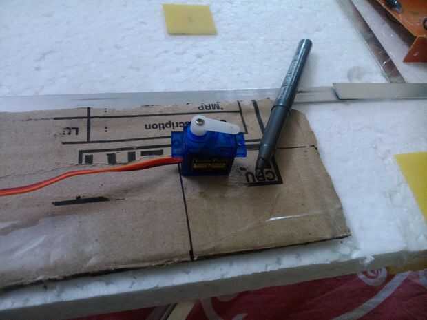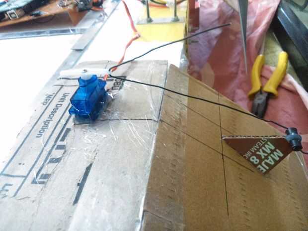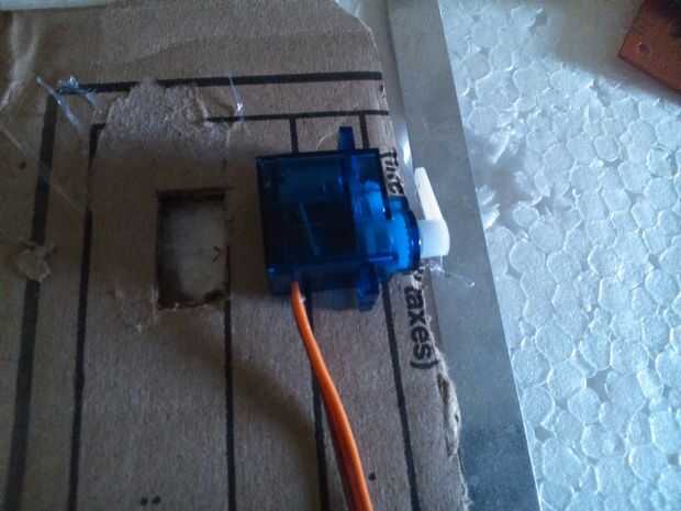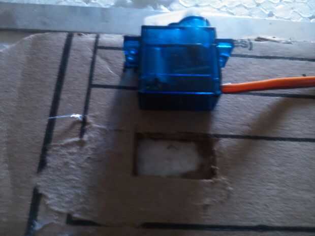Luego cortar un agujero en el cartón del tamaño del servo y caliente pegado el servo en el agujero para que no se romperá fácilmente durante la operación