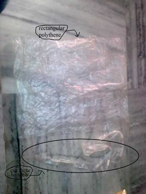 utilicé un polietileno para skirt.polythene tiene asas así que tenemos que cortar y también tenemos que cortar base de polietileno de polythene.now es en forma rectangular como se muestra en el sello figure.now el abiertos extremos de polythene.now parece una bolsa rectangular o tus papas fritas paquete como se muestra en la figura. Ahora hacer un agujero en el lado de polietileno ligeramente más grande que el ventilador de la computadora y hacer un agujero rectangular en polietileno en otro lado.