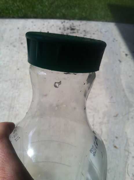 Para arriba hacia la parte superior de la botella, perfore otro agujero o dos para que entre aire en la botella como viertes, de lo contrario el agua apenas se gotear hacia fuera. Tenga cuidado con esta parte de la botella puede ser resbaladiza y el taladro se deslice en vez de ir a través de la botella. No use los pies para sostener la botella constante.