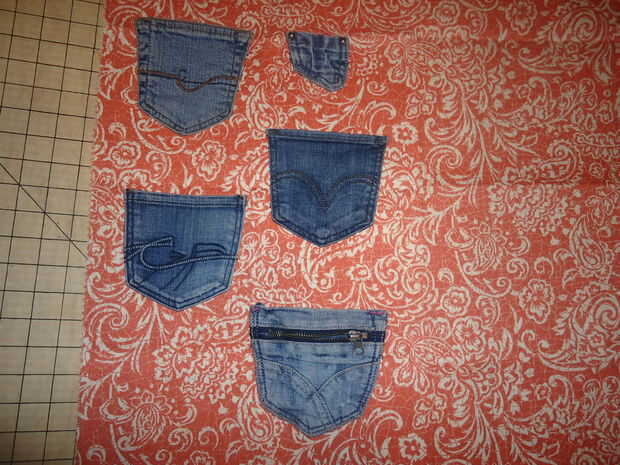 Una vez que todos los bolsillos se cortan tus jeans viejos, usted puede averiguar dónde se coloque. Tan del lugar sus reciclados bolsillos sobre la tela donde desea a coserlas. Este fue mi primera decisión de la colocación. Por supuesto que son capaces de cambiar si quieres.