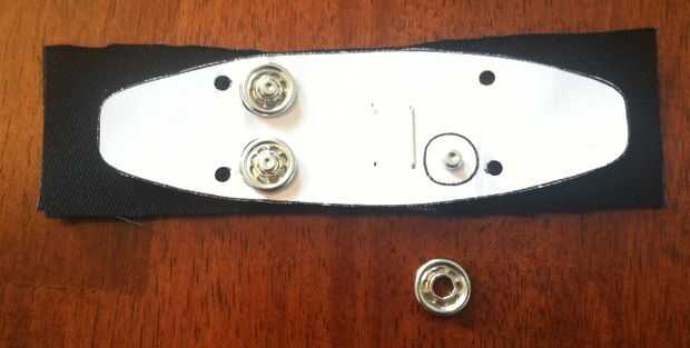 1. Corte la plantilla de "Atrás" y los tres agujeros para los broches de presión. Usted debe hacer este antes de fijar la plantilla a la tela. Hacer esto tan precisamente como sea posible, de lo contrario los broches no aparean correctamente con el Zeo.