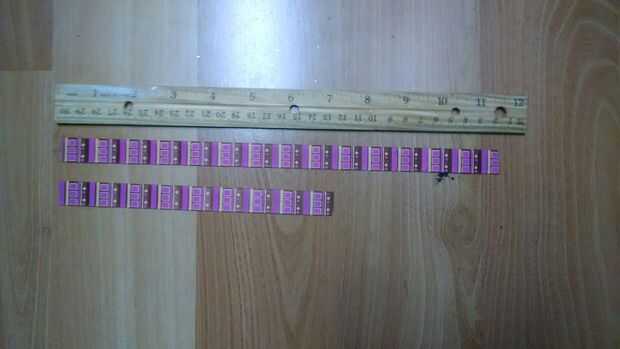 Tomar la cinta y cortar cuatro piezas aproximadamente de 7" de largo y otros cuatro pedazos de 11 1/2" de largo. Si el botón tenía un lazo pequeño en la parte trasera para coser en tela, rompa con tijeras o pinzas (de lo contrario no pegue al arco correctamente).