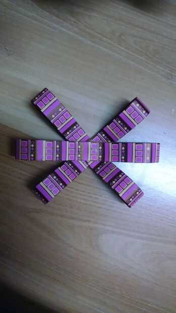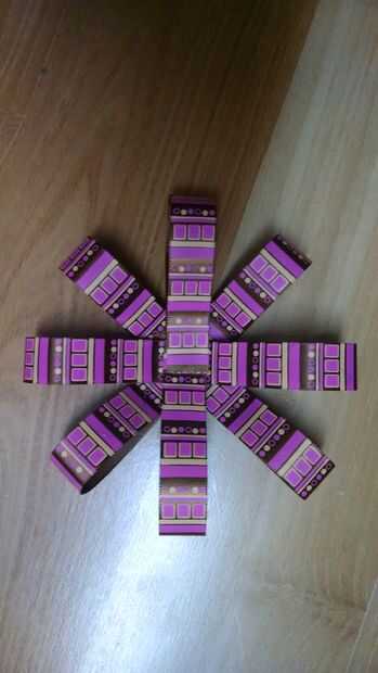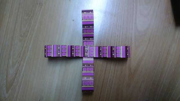 Una vez que haya terminado de pegar, las cintas deben parecerse a los de cuadro uno. Ahora es el momento para hacer el arco! Tomar la primera pieza larga y poner un punto de pegamento en el centro, luego tome la segunda pieza larga y poner horizontal por lo que parece una cruz como en la imagen. Seguir poniendo puntos de pegamento en el centro de la cinta y pegar los pedazos de la cinta hacia abajo como se ve en las fotos hasta que el arco se crea. Cuando arreglo la segunda capa de cintas más cortos, no capa cada pedazo de cinta corta en la parte superior la cinta larga. Arreglar para que la cinta corta es capas de los huecos de la cinta larga. Suena confuso, así que hice un pequeño garabato que aclararlo. Básicamente, usted quiere el arco para que parezca obviamente hay ocho pétalos a la flor del"", no cuatro. Así, el arco parece más completo.