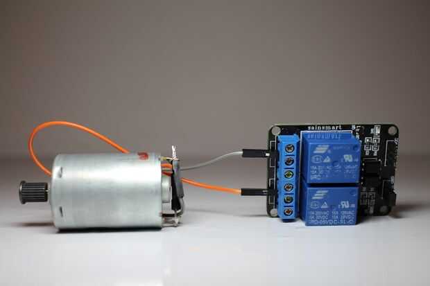 En este proyecto, ambos cables del motor se conectarán a cada una de las entradas COM (medio) de los interruptores de relé.