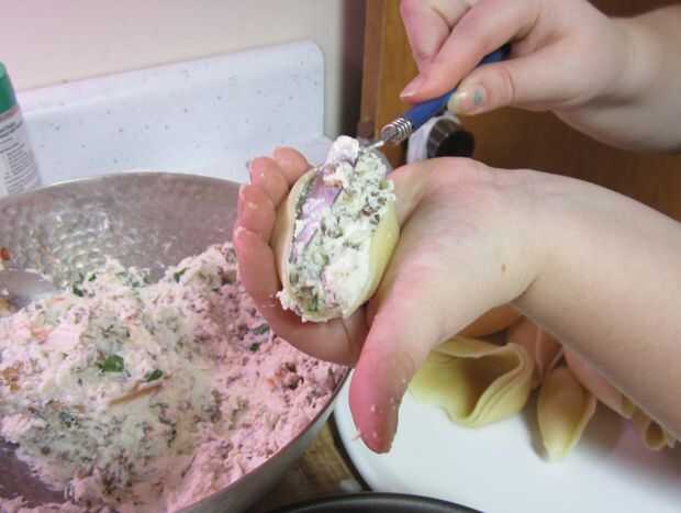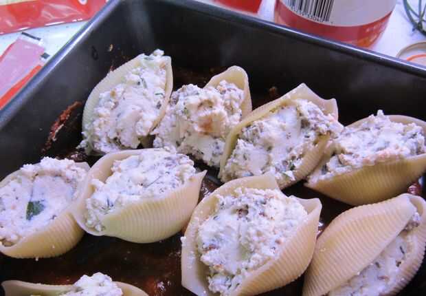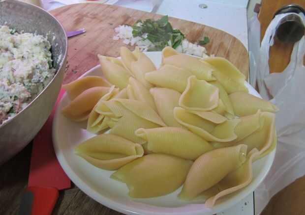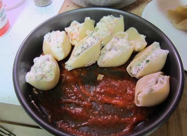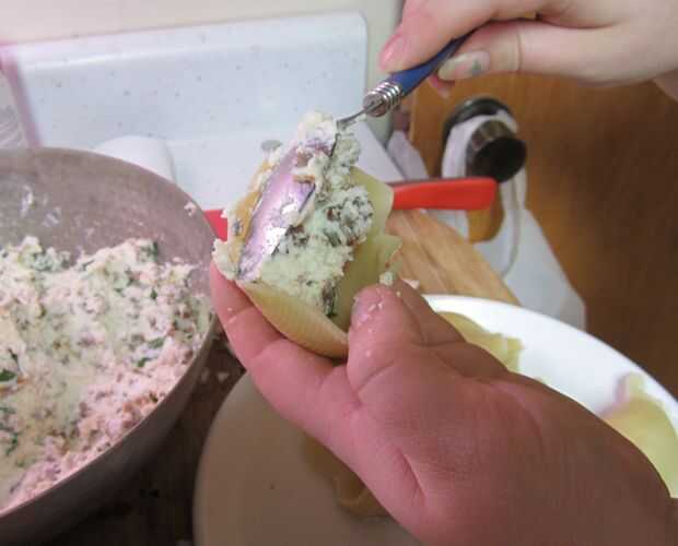 Por este tiempo, las cáscaras habremos terminado de cocinar - drenaje y coloque sobre una placa. Con una cuchara, poner la mezcla en las cáscaras. Asegúrese de llenar las cáscaras con la mezcla yummy!