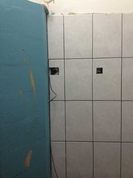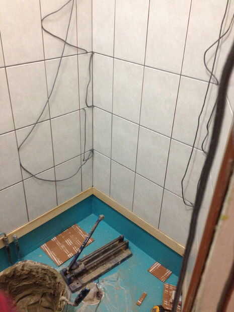 Hemos querido iniciar desde las esquinas que se verá y dejan cortes en las esquinas que se tratarán. Hacer las paredes y el piso. Cuando baldosas se ajustan y secan (día siguiente) sacar tablas y agregar fila falta de azulejos de la pared.