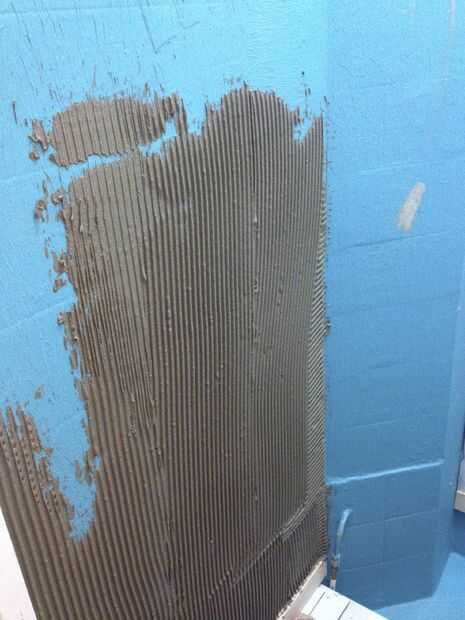 Recomiendo tener un compañero para verter el agua lentamente mientras se mezcla en velocidad lenta. Para probar su lugar de capa delgada pequeña cantidad sobre un pedazo de desecho azulejo, forma un pico. Si la forma tiene, han mezclado el mortero correctamente y si cae, necesita más mortero y si se desmorona, necesita más agua. Dar un descanso de 5-10 minutos (agarrar una cerveza o un café) y luego mezcla otra vez para el par de minutos y se realizan.