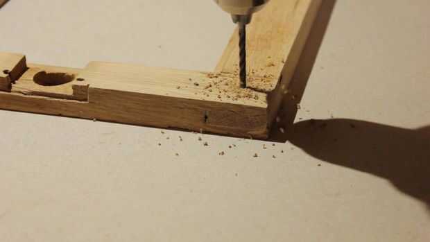 Una vez que he terminado con la lija, me Marque y perfore un orificio de un botón. El nuevo hardware de bloqueo es el siguiente y tengo que modificar un poco el borde de la madera. Con la modificación completa que pruebo ajuste el nuevo mecanismo de bloqueo y atorníllelo en forma permanente.