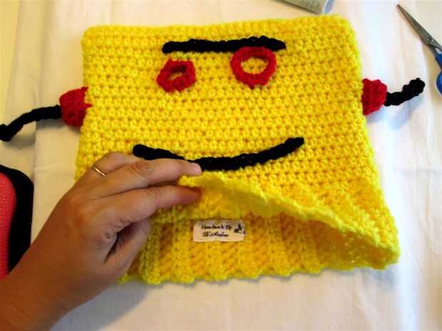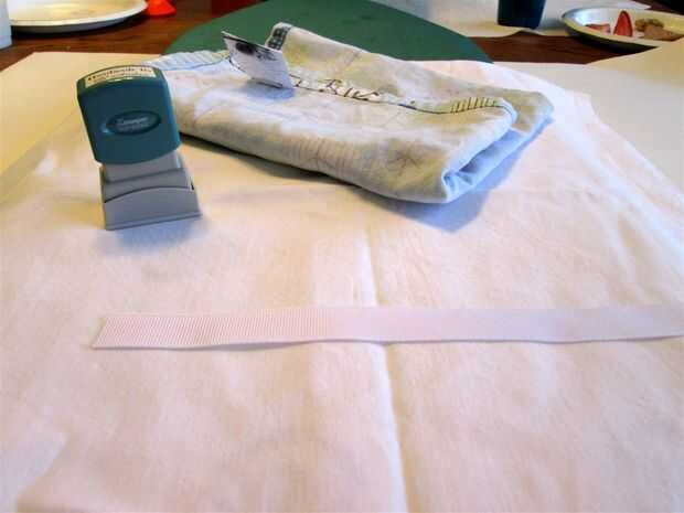Comenzó con una idea sencilla que he visto antes: tomar un lindo sello y sello sobre algo de tela para hacer una etiqueta y coser sobre la prenda (en mi caso un sombrero crocheted.)
