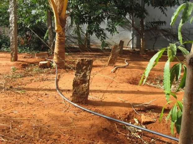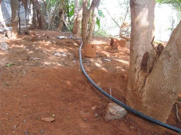 Del tanque de agua, colocamos el tubo flexible de 12,5 mm a lo largo de los árboles frutales. Utiliza la canteador recta para unir trozos de tubos y había atado la tubería con el tronco de los árboles utilizando alambre de GI. Pedazos de ladrillos y piedra fueron colocados bajo la tubería para evitar de ser enterrado en el suelo.