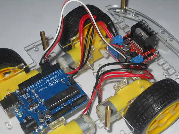Ahora que el proyecto es hacer ver que sería mejor utilizar az Arduino Mega, pero funciona también con el UNO, el único problema es que debo utilizar un segundo microcontrolador para el 2. versión del proyecto. Coloqué mi UNO en el centro de la caja y conectados cuatro cables en los pines digitales siguientes: 4, 5, 6, 7 entonces les conectadas a las entradas de señal del controlador del motor.